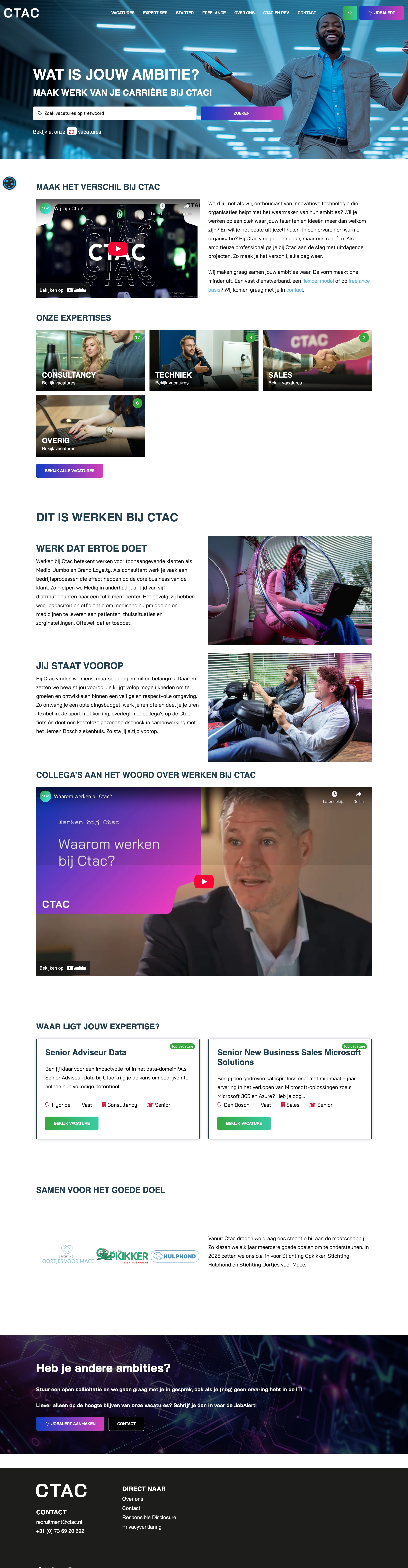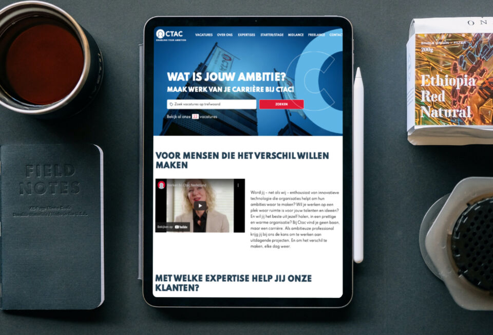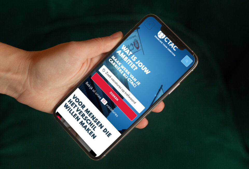 Voor Ctac hebben we de nieuwe werken-bij website gemaakt, gekoppeld met Carerix. De website heeft nog een extra design gekregen om deze volledig aan te passen aan de corporate website. Ook wordt, om de Nederlandse sollicitanten nog beter te bereiken, de pagina uitgebreid met een landingspagina.