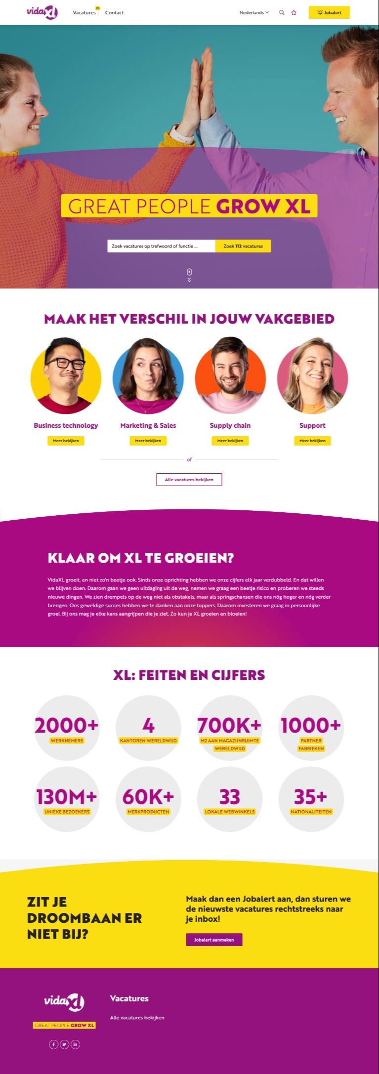 Het succes van vidaXL zit in het inkopen van producten en het aanbieden van deze producten tegen concurrerende prijzen. Continu wordt er gezocht naar nieuwe kostenbesparende maatregelen, zonder in te leveren op kwaliteit. Dit kunnen zij niet alleen: dagelijks zetten honderden collega's zich in om bij te dragen aan dit succes. Om de instroom van nieuwe medewerkers te ondersteunen, hebben wij voor vidaXL een vernieuwde werken-bij website gemaakt. Met deze website gaat vidaXL op zoek naar nieuwe medewerkers in ruim 30 verschillende landen.