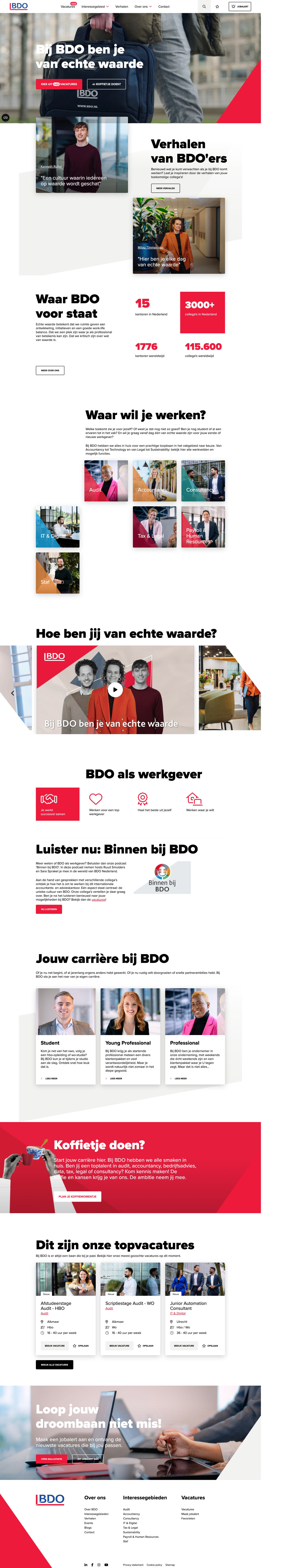 Voor BDO hebben we een nieuwe werken-bij website ontworpen, gebouwd op ons Recruitment CMS Serena. Het proces om deze website te bouwen is begonnen met een kickoff sessie, waarna ons team van designers aan de gang ging met de website. Na goedkeuring begonnen we met het bouwen van de website gebaseerd op dit design en de koppeling van het ATS systeem van SmartRecruiters. Ook werden de statistieken ingericht in Google Analytics door ons marketingteam. Het resultaat: een nieuwe werken-bij website waarmee BDO aan de slag kan om nieuw personeel te werven!