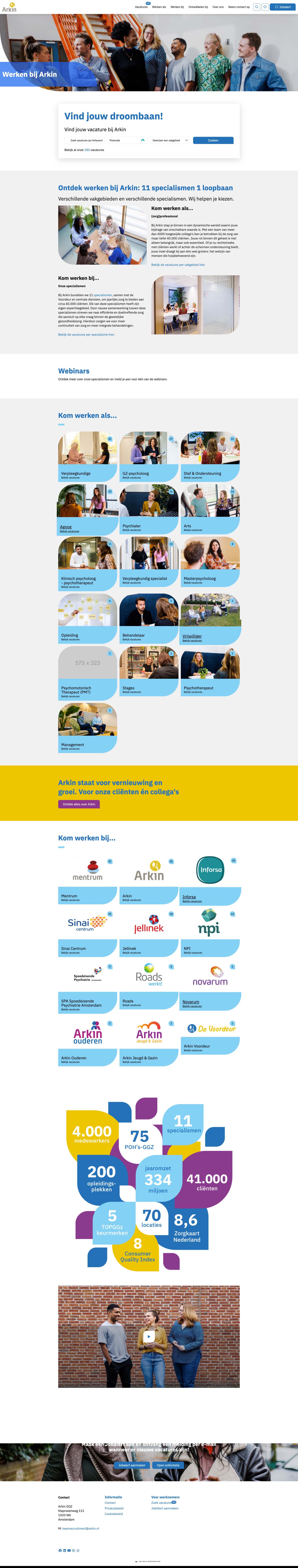 Arkin biedt met 11 specialismen hoogwaardige geestelijke gezondheidszorg aan ruim 40.000 cliënten. Elk behandel- en expertisecentrum heeft een eigen specialisatie, waardoor mensen met diverse vormen van problematiek terechtkunnen bij meer dan 70 locaties in Noord-Holland, Utrecht en Flevoland. De specialismen richten zich op de behandeling van verslavingen, depressies, trauma’s en ernstige (ook meervoudige) psychiatrische aandoeningen. Daarnaast wordt preventief gewerkt en is Arkin actief zichtbaar in de wijk.