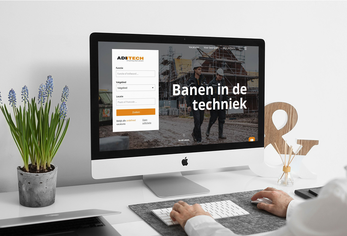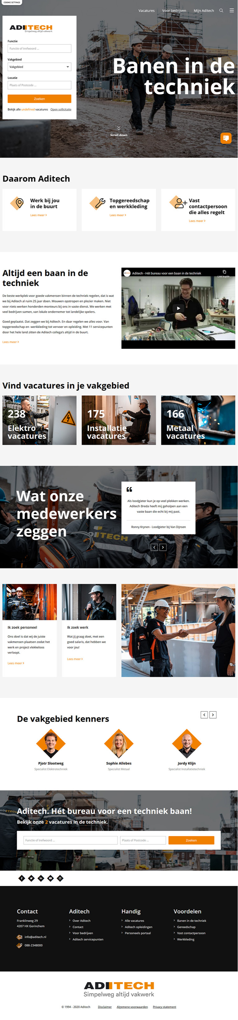 Aditech zorgt voor goede vakmensen in de techniek, al 25 jaar. Niet alleen zorgen ze voor werk, ze regelen ook alles eromheen, zoals het gereedschap, werkkleding, vervoer en opleiding. Met 11 vestigingen door heel Nederland zijn ze altijd in de buurt. De recruitment website die tot op heden actief was, sloot niet meer aan bij de wensen en behoeftes van Aditech, daarom werden wij ingeschakeld. Deze strakke site is ontwikkeld op ons nieuwe CMS.